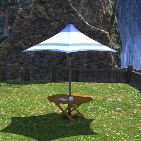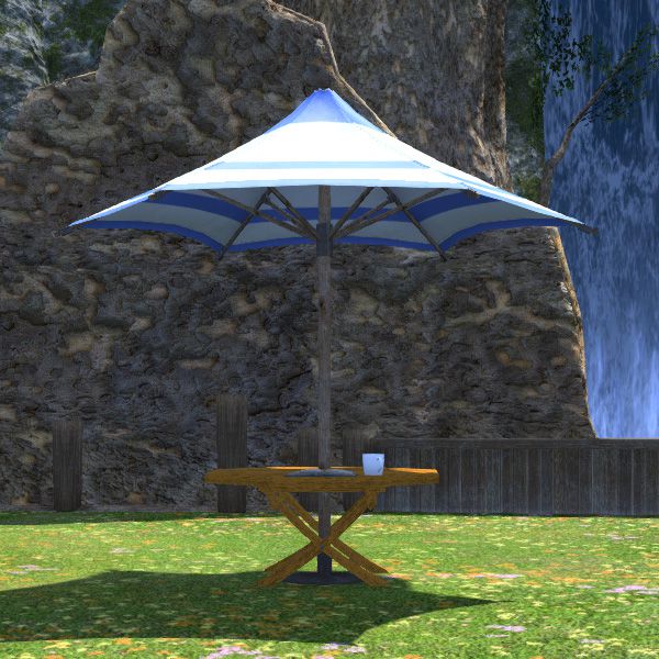Ein einfacher Tisch mit Sonnenschirm, welcher optisch an die Landschaft der Cieldaläen-Inseln angepasst wurde.