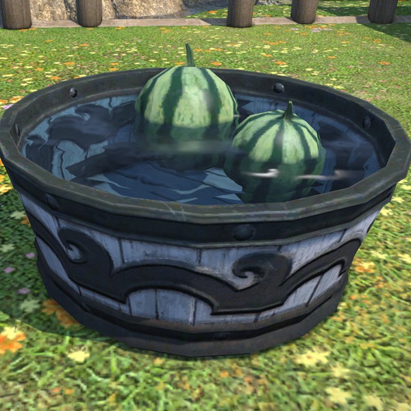 In dem mit Wasser gefüllten Holzgefäß werden oft Früchte gekühlt.