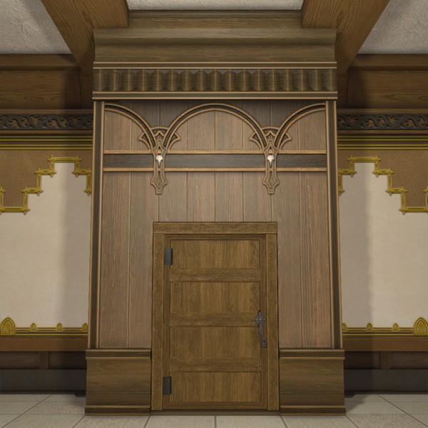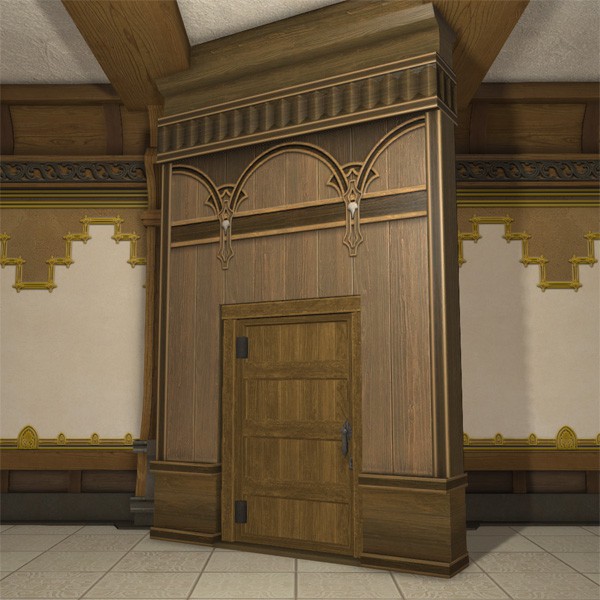 Ein Raumteiler aus dunklem Holz mit eingebauter Tür, der sich gut in Unterkünften gridanischer Bauart macht.