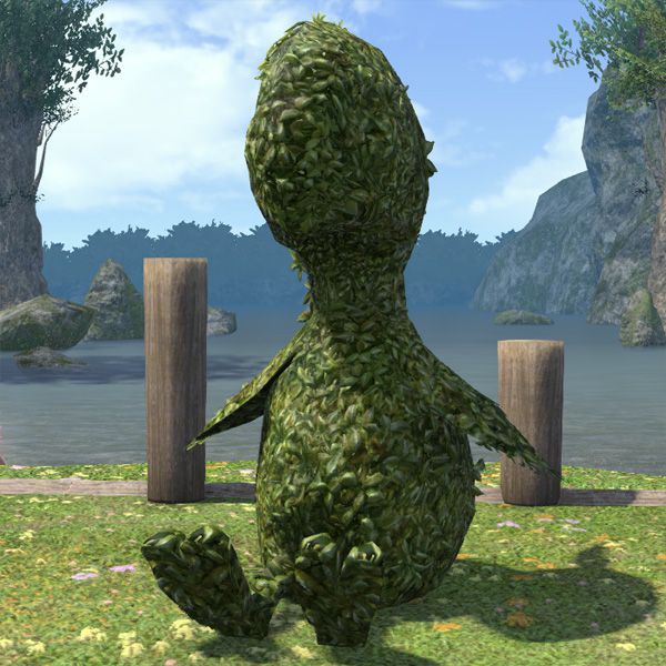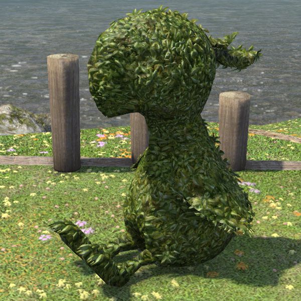 Ein in Chocobo-Form zurechtgestutzter Busch.