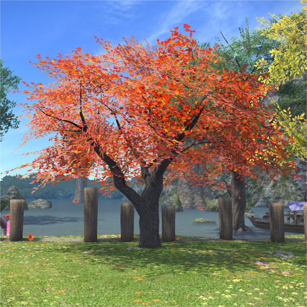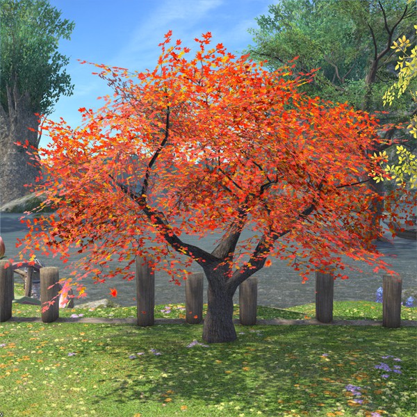 Ein Ahornbaum mit rötlich verfärbtem Laub, das schon herabzufallen beginnt. Schafft eine herbstlich-melancholische Stimmung im Garten.
